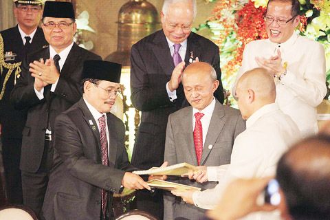 但這也不對,記得去年年底,在我國的協助下,菲律賓政府與菲南的摩洛回教叛軍簽署了一項“和平框架協議”嗎?首相納吉還特別飛去菲律賓做見證,菲律賓總統阿奎諾還向納吉深表感謝呢!